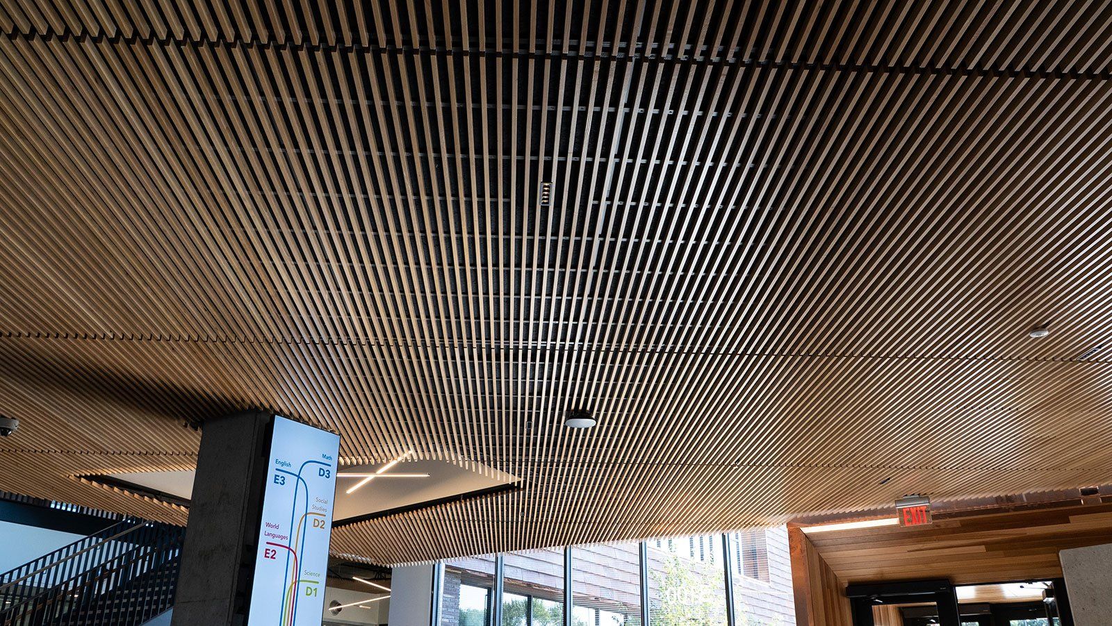 Grille panels are excellent visual design elements for great-looking ceilings and walls. Grille ceiling installation is easy using our attachment clip system to 15/16″ HD T-Bar grid, and both backered and doweled panels are 100% accessible. Use screws for easy wall panel direct attach installation. Standard rail dimensions and spacings are available on our website. Grilles can be stained to match a control sample, and perimeter trim options are available. The system offers design flexibility with five grille styles available. Grilles may be paired with acoustical liner for enhanced acoustics. View Here